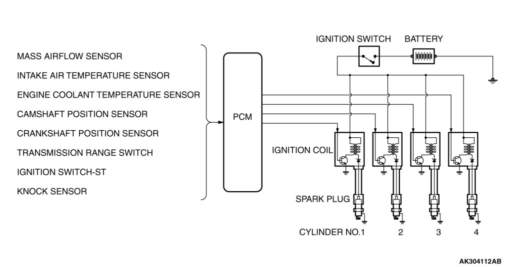 The powertrain control module (PCM) controls the four ignition power transistors to turn them alternately ON and OFF. This causes the primary currents in the ignition coils to be alternately interrupted and allowed to flow to fire the cylinders in the order 1-3-4-2.
