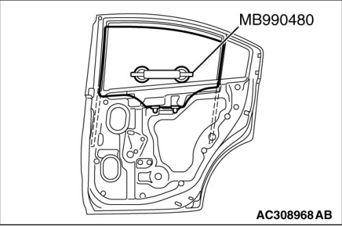 If tinting film is adhered to the door window glass, attach special tool MB990480 to the outside of the glass to prevent the film from peeling off.