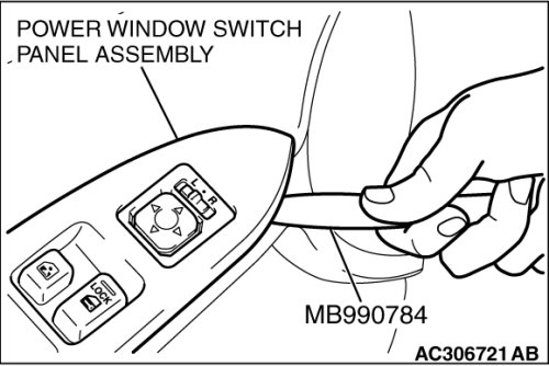 Insert special tool MB990784 as shown to remove the power window switch panel assembly.