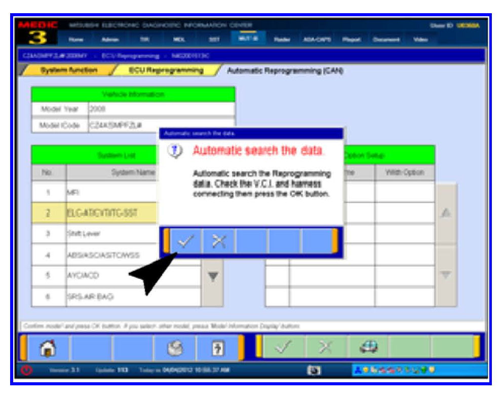 5. In the "Automatic search the data" dialog box, click the check mark to begin a search for reprogramming data.