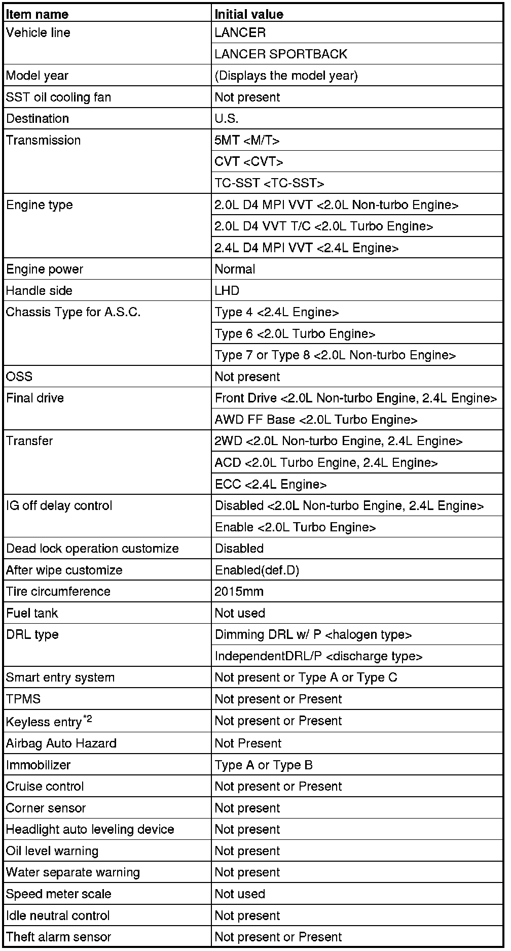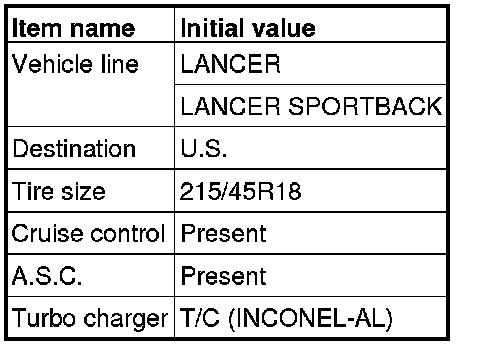 14. If the displayed coding information is different from the corresponding initial setting in the list, replace the ECU with a correctly coded one. For replacement of the engine control module, refer to Engine Control Module Removal and Replacement [2.0L Non-turbo Engine] or Engine Control Module Removal and Replacement [2.0L Turbo Engine] or Engine Control Module Removal and Replacement [2.4L Engine]. For replacement of the TC-SST-ECU*, refer to Transaxle Assembly . For replacement of the ETACS-ECU, refer to ETACS Electronic Time and Alarm Control System (ETACS)-ECU Removal and Installation.