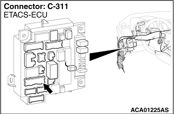 STEP 3. Check trunk lid lock actuator connector F-12 and ETACS-ECU connector C-311 for loose, corroded or damaged terminals, or terminals pushed back in the connector.