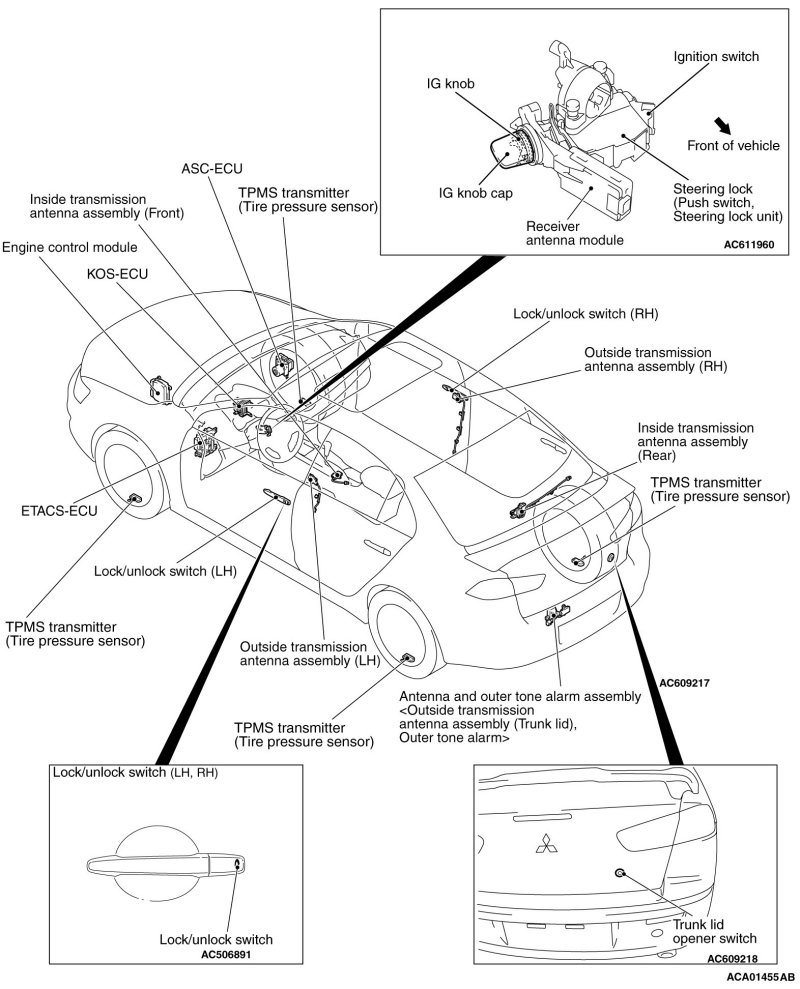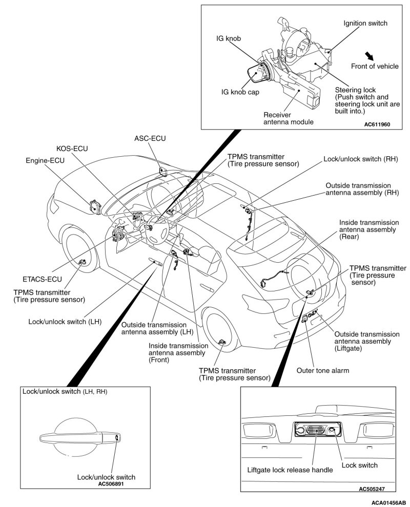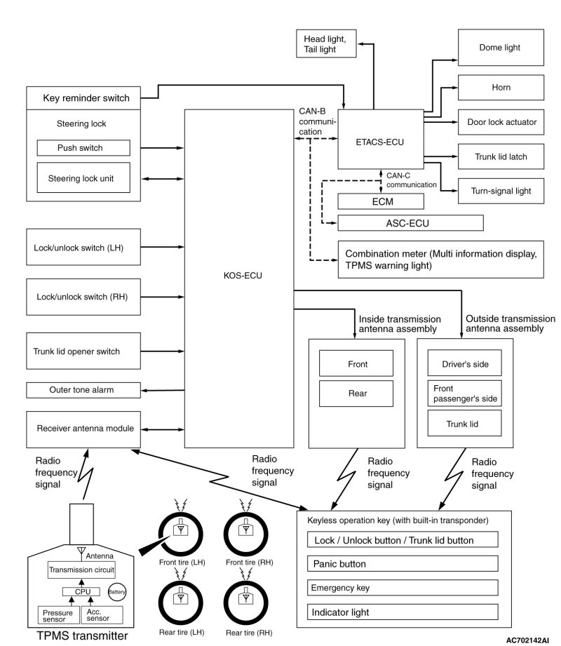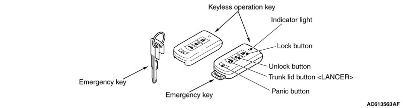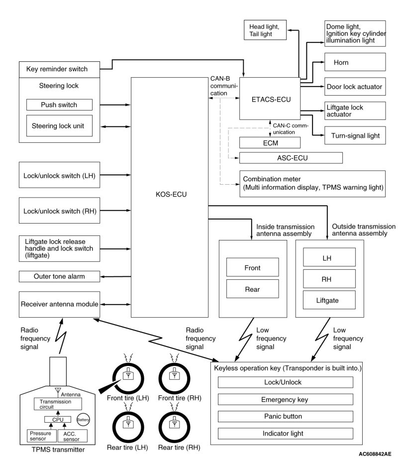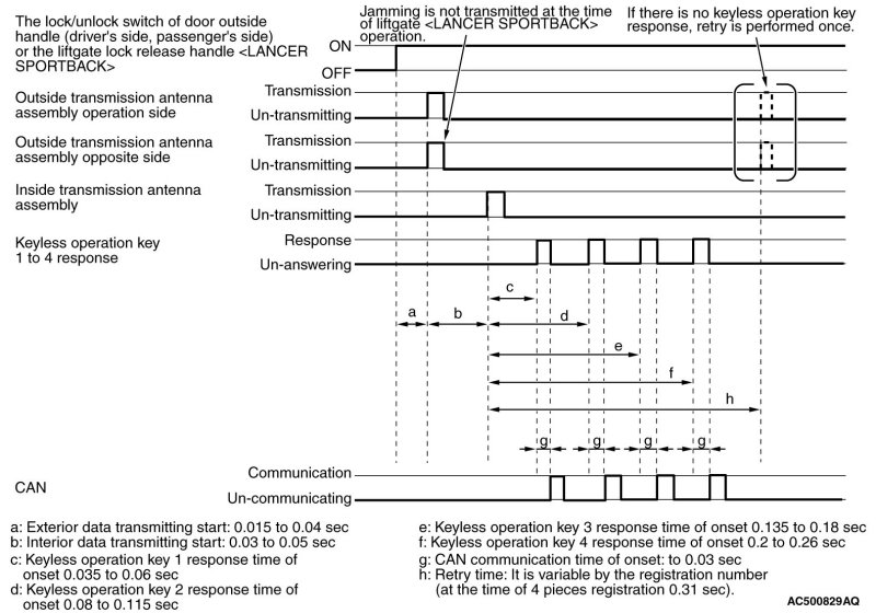 is turned ON. When KOS-ECU certifies the registered keyless operation key only on the outer side of the vehicle, it requests ETACS-ECU to lock all the doors and the liftgate [LANCER SPORTBACK].