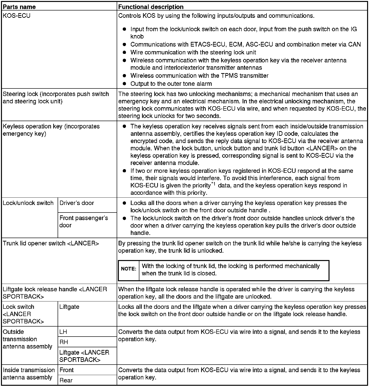 (opening/closing of all doors, opening of trunk lid [LANCER] or liftgate [LANCER SPORTBACK], and operation of warning function that warns a person who intends to damage the vehicle *) by operating the lock/unlock /trunk lid [LANCER] button and panic button on the keyless operation key. The system also incorporates the immobilizer function that prohibits the starting of engine by using an unauthorized key as well as the tire pressure monitoring system (TPMS) that issues a warning to a driver by illuminating or flashing the warning light if an abnormality to the tire pressure or system is detected. KOS has the following features: