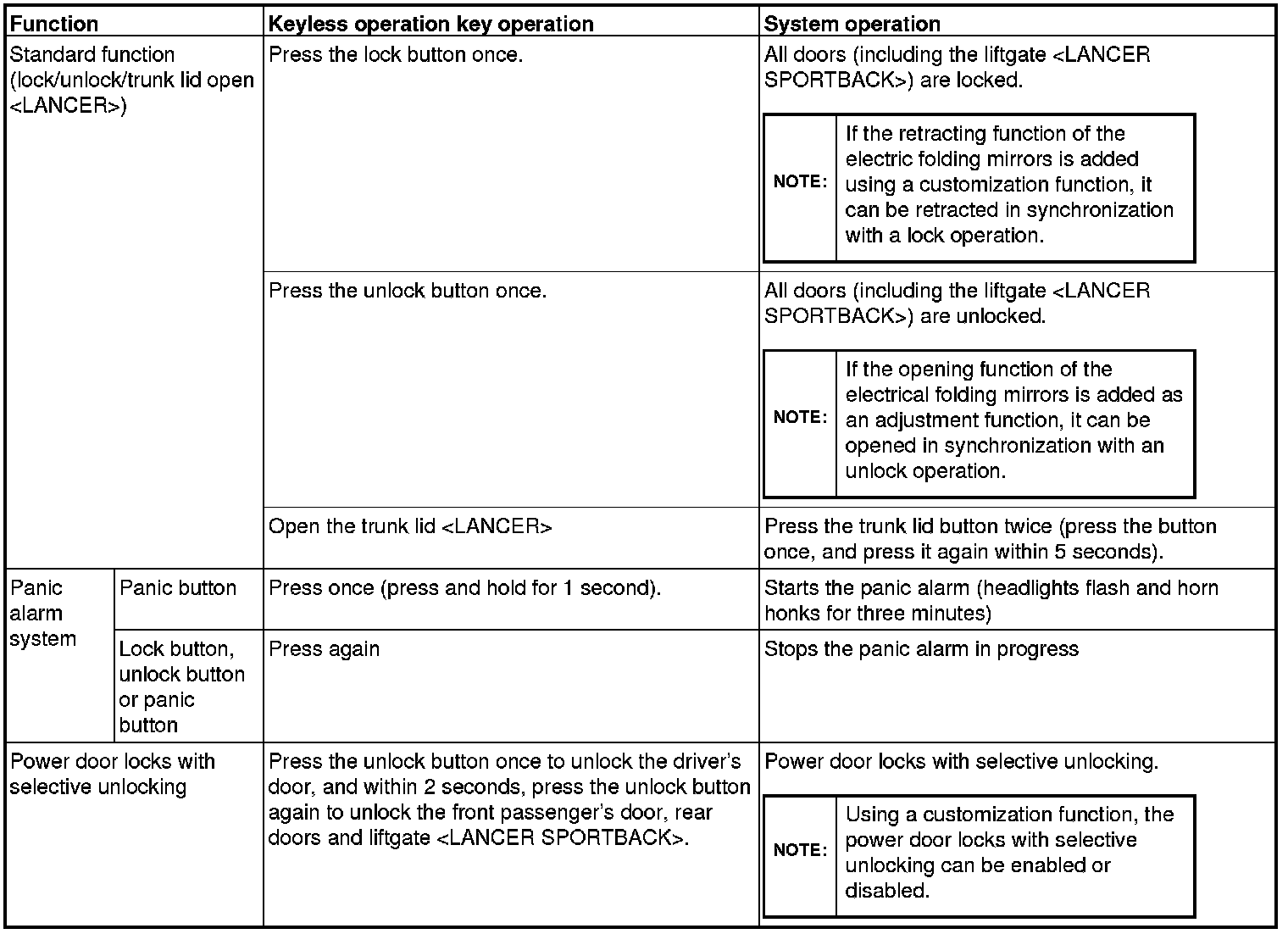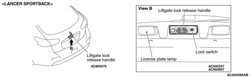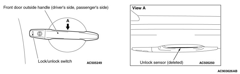 - When the lock/unlock switch of door outside handle (driver's side) is pressed once, only the driver's door is unlocked. When the lock/unlock switch of door outside handle (driver's side) is pressed once again within 2 seconds after the driver's door is unlocked, the front passenger's door, rear doors, and the liftgate [LANCER SPORTBACK]