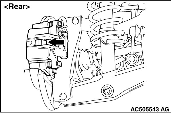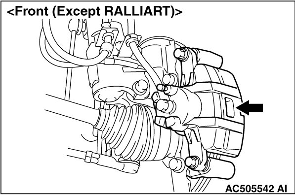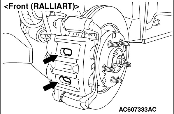 2. If the brake pad thickness is less than the limit value, replace the brake pad (Refer to Brake Pad Replacement[Except Ralliart] [Except RALLIART] or Brake Pad Replacement[Ralliart] [RALLIART]).