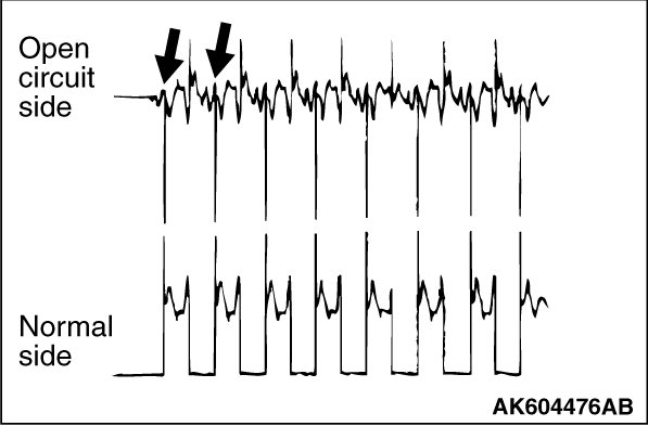- Current is not supplied to the motor coil on the open circuit side. (Voltage does not drop to 0 volt.) Furthermore, the induced electromotive force wave pattern at the normal side is slightly different from the normal wave pattern.
