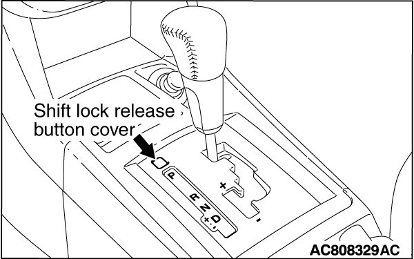 2. Remove the shift lock forced release switch cover shown in the figure. While pressing the shift lock forced release switch with a screwdriver or a similar tool, move the selector lever.