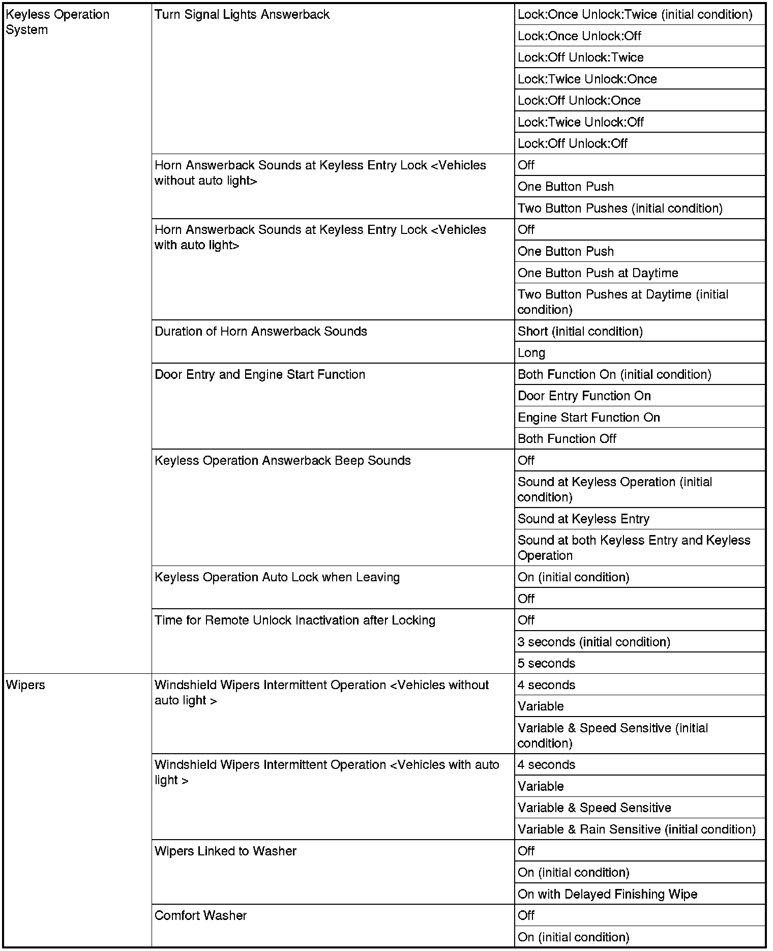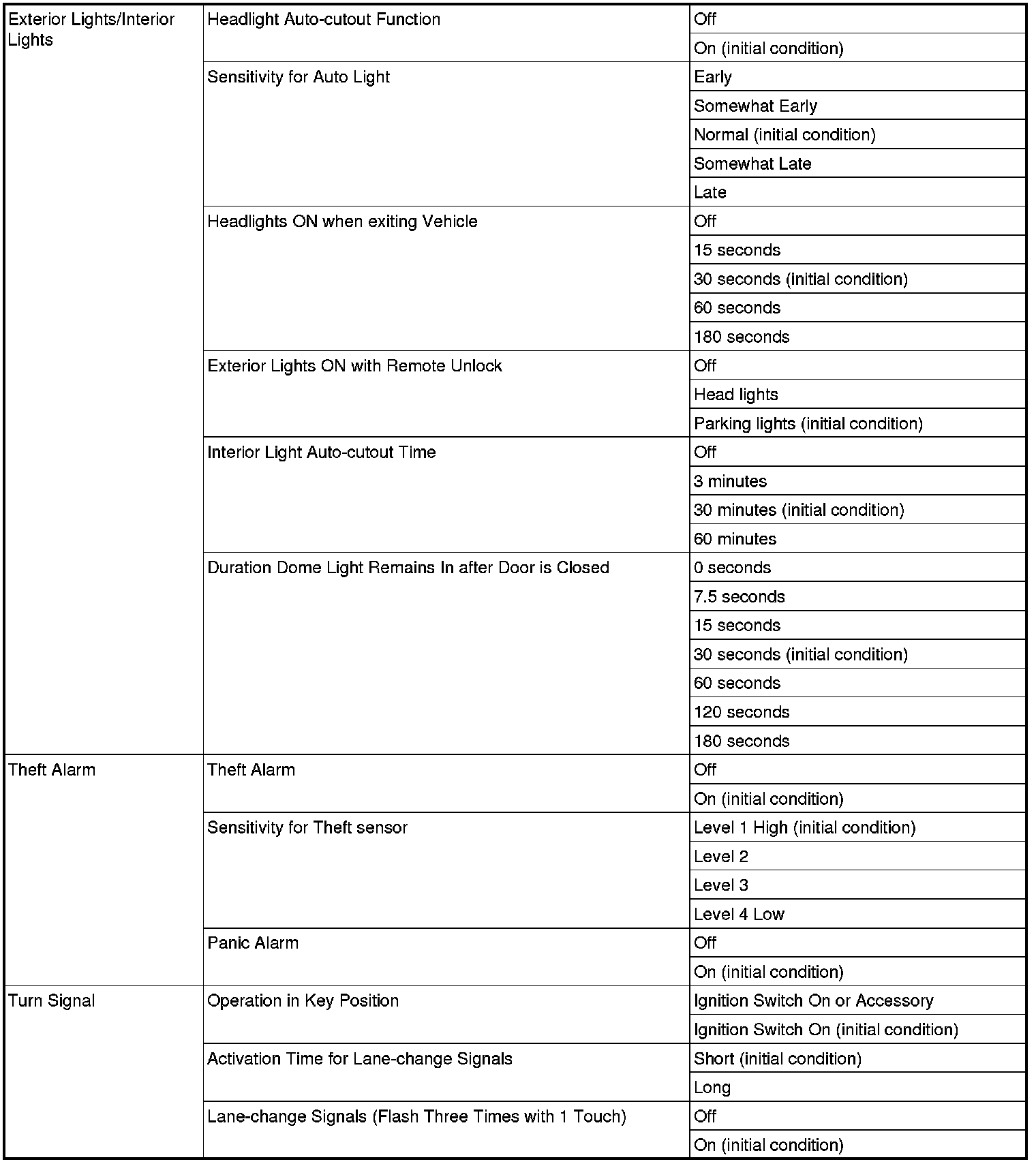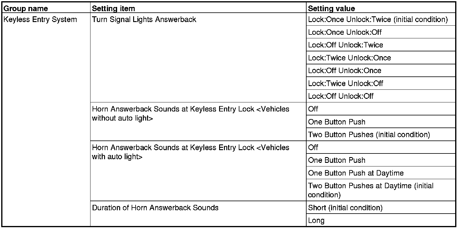 The following ETACS functions can be customized by selecting "Equipment" on the "Settings"