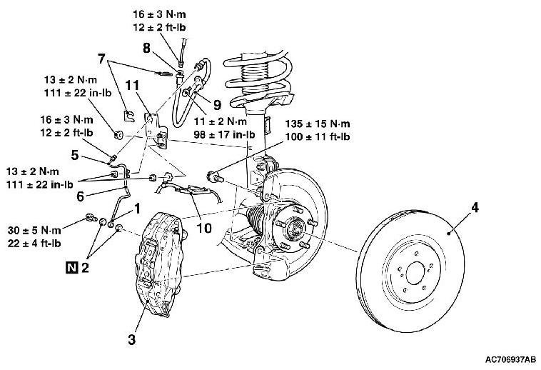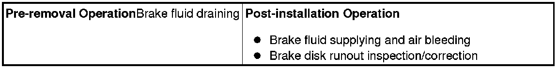 Take care not to contact the parts or tools to the caliper because the paint of caliper will be scratched. And if there is brake fluid on the caliper, wipe it off quickly.