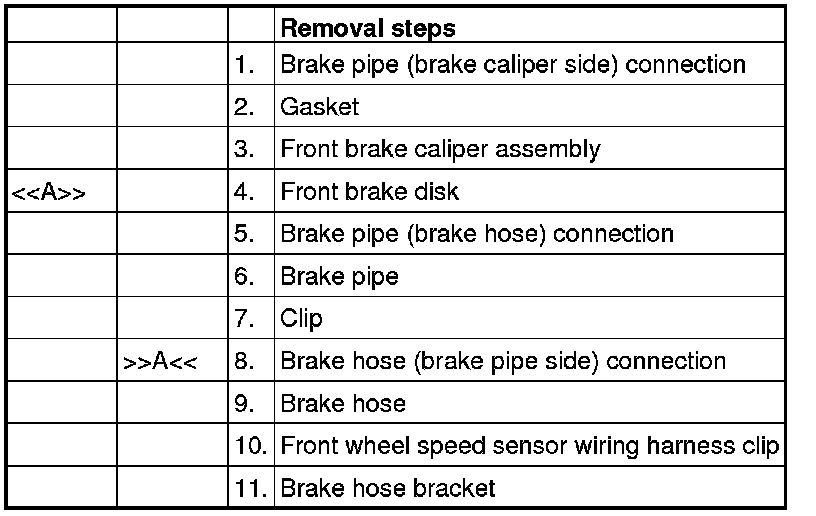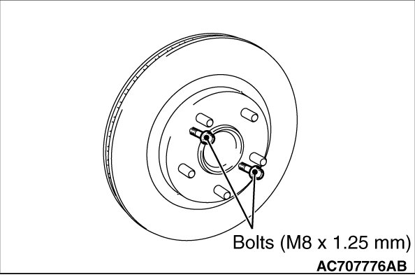 If the front brake disk removal is difficult, install bolts (M8 x 1.25 mm) shown in the figure, and tighten them evenly and gradually to remove the front brake disk.