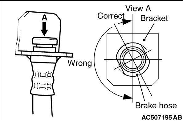 4. Twist the brake hose toward the lesser torsion between the brake hose and body-side bracket as shown in the figure, and fix it to the body-side bracket with a clip.