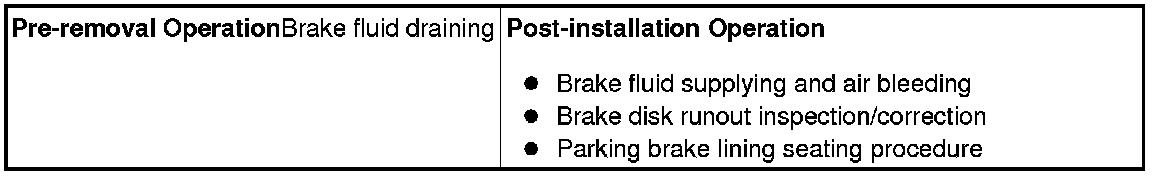 Take care not to contact the parts or tools to the caliper because the paint of caliper will be scratched. And if there is brake fluid on the caliper, wipe it off quickly.