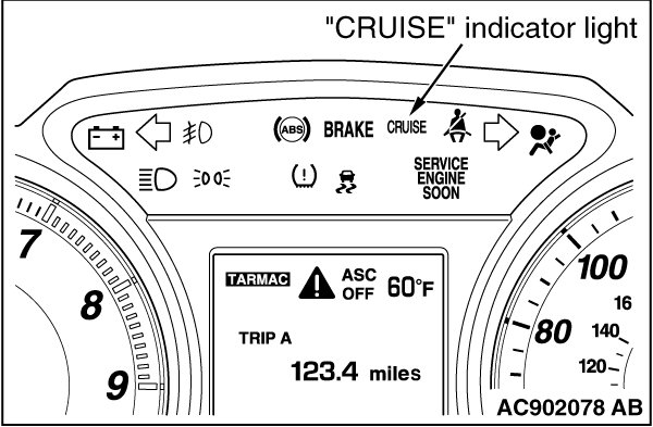 2. Check that the "CRUISE" indicator light within the combination meter illuminates when the "ON/OFF" switch is pressed (cruise control system: ON.)