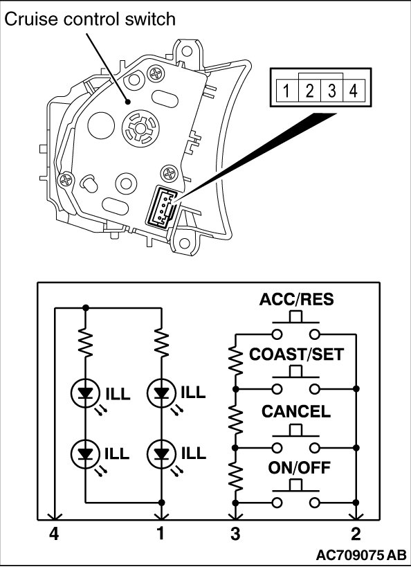 3. Check that the cruise control switch illuminates when a positive battery terminal is connected to the connector terminal number 4, and terminal number 1 is grounded.
