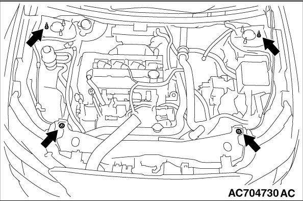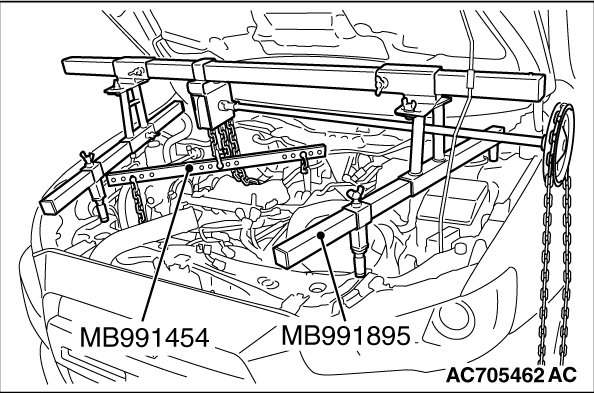 (2) Mount special tool MB991454 to the power steering oil pump bracket and the engine hanger, and set it to special tool MB991895 to support the engine and transaxle assembly.