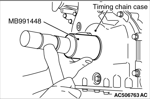 Using special tool MB991448, press in the crankshaft front oil seal up to the chamfered surface of timing chain case.
