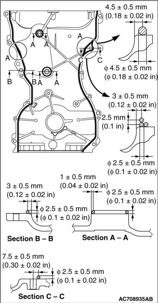 4. To the timing chain case assembly mating surface, apply the sealant with a width of 2.5 ± 0.5 mm (0.1 ± 0.02 inch) and without a gap. However, with the "A" shown in the figure, apply the sealant with overlapping the diameter of 4.5 ± 0.5 mm (0.18 ± 0.02 inch) or 2.5 ± 0.5 mm (0.1 ± 0.02 inch) as shown in the figure.