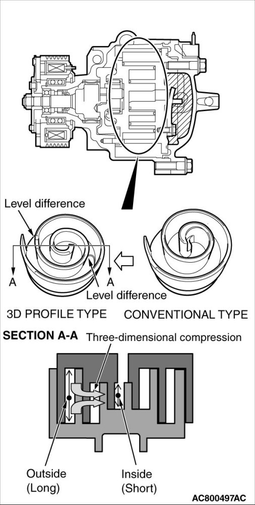 The refrigerant is compressed also in the tooth depth direction (three-dimensional compression) to improve the compression efficiency.