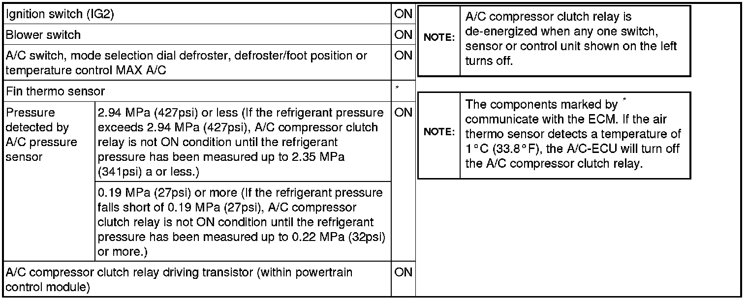 - When the fin thermo sensor is activated, and the ignition switch, blower switch, and A/C switch are ON, the A/C compressor clutch relay is energized.