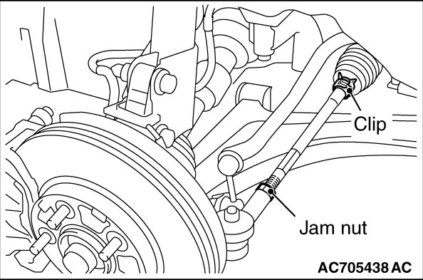 1. Loosen the jam nut with the tie-rod clip removed, and then perform the adjustment by turning the tie-rod left/right at the same degree in the opposite direction.