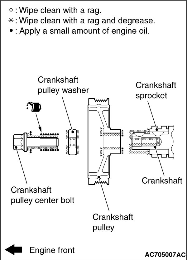 2. Wipe off the dirt on the crankshaft sprocket, the crankshaft and the crankshaft pulley as shown in the figure using a rag, and then degrease them.