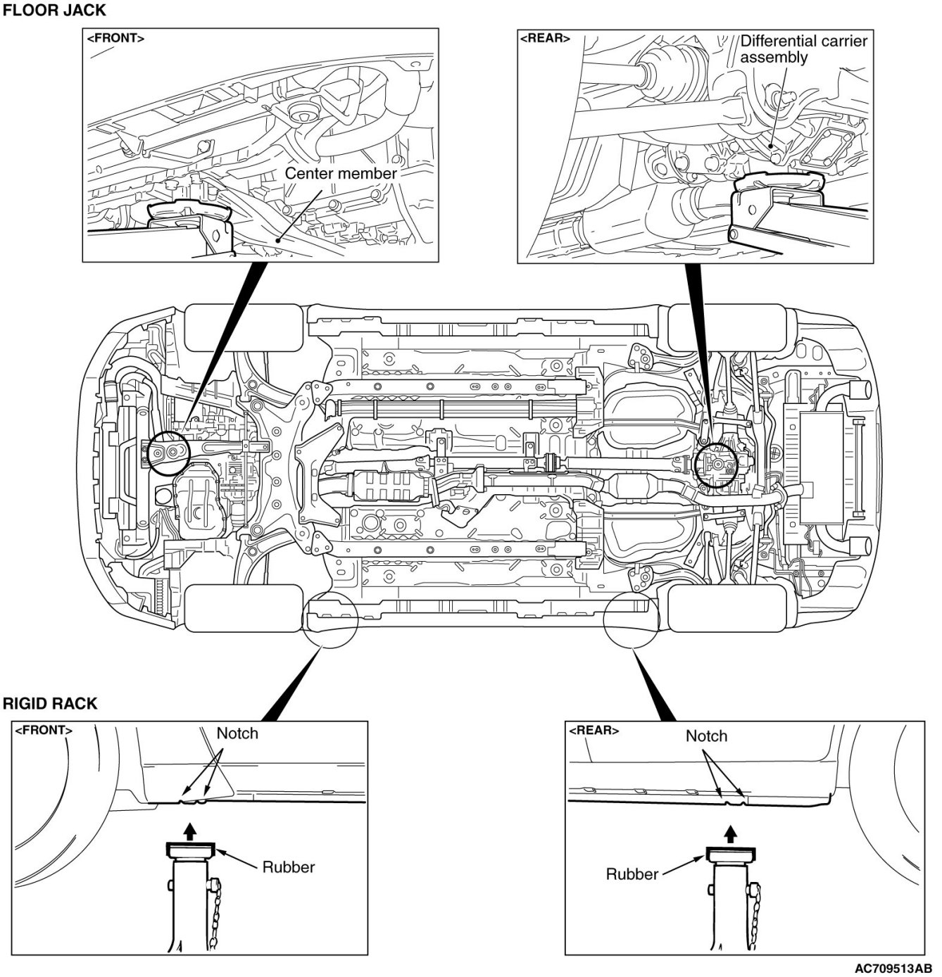 Special care should be taken when raising the vehicle on a frame contact type hoist. The hoist must be equipped with the proper adapters in order to support the vehicle at the proper locations.