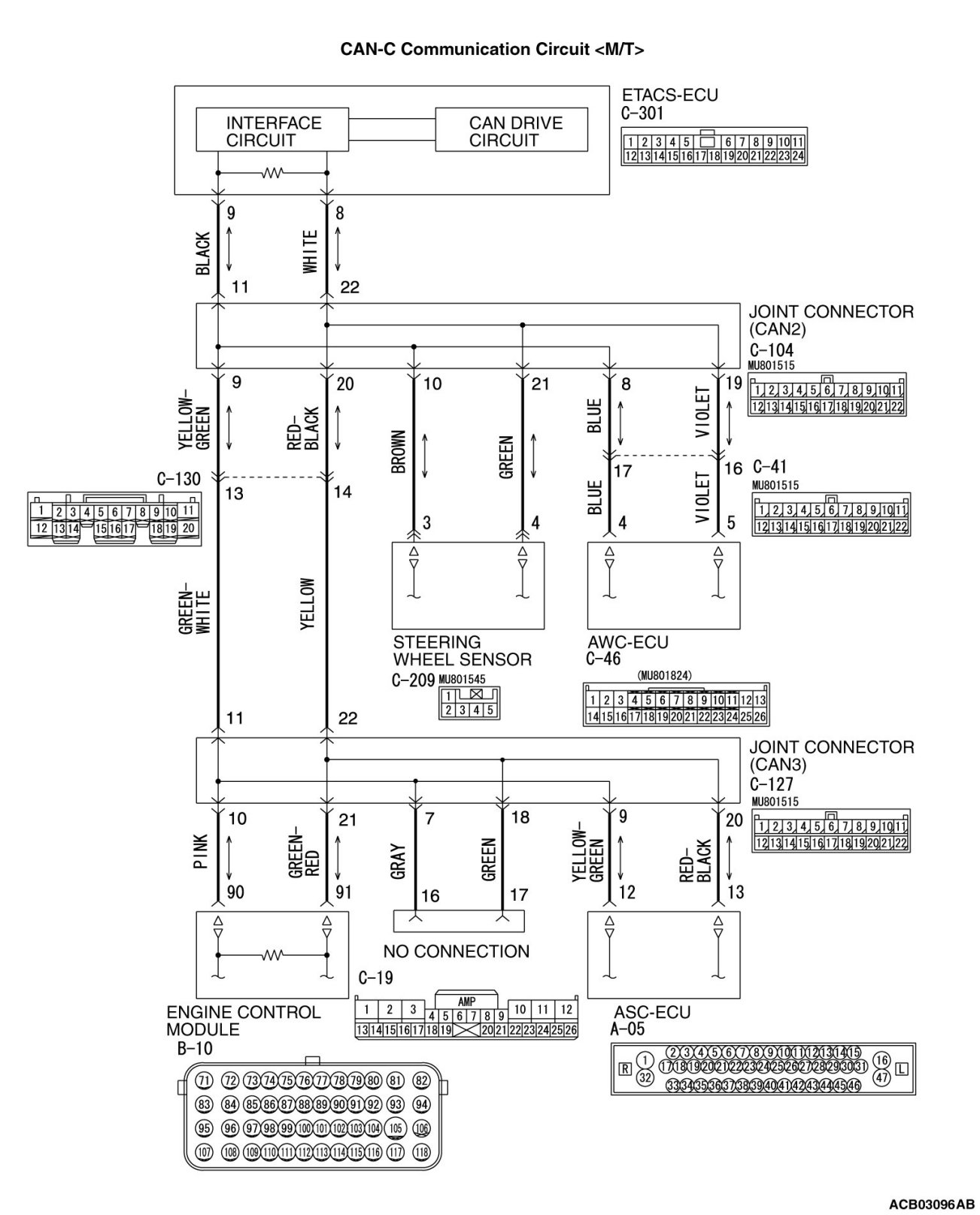 (2)Check the wiring harness between joint connector (CAN2) C-104 (terminal 11) and ETACS-ECU connector C-301 (terminal 9)