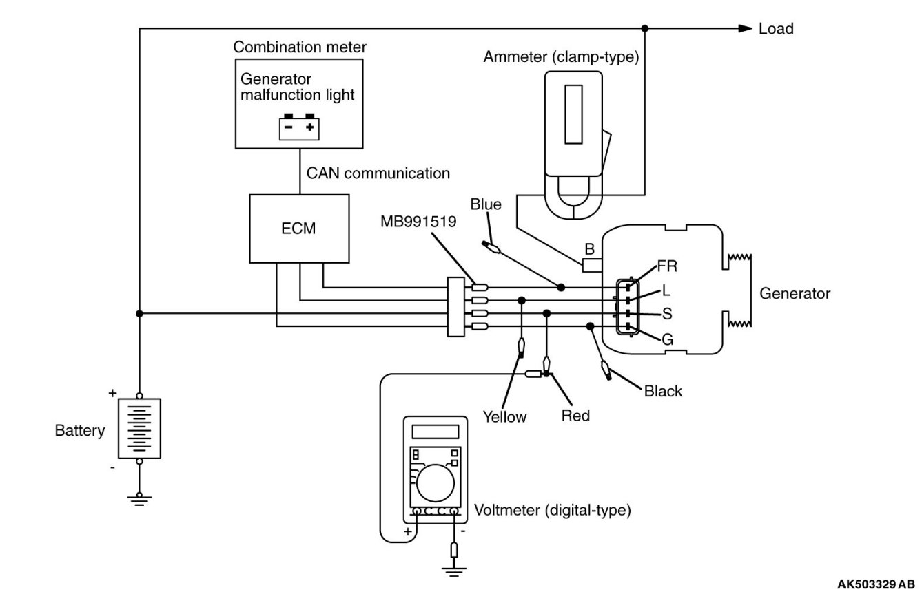 4. Use the special tool (Generator harness connector: MB991519) to connect a digital-type voltmeter between the generator "S" terminal and ground. (Connect the positive lead of the voltmeter to the "S" terminal, and then connect the negative lead of the voltmeter to a secure ground or to the negative battery terminal.)