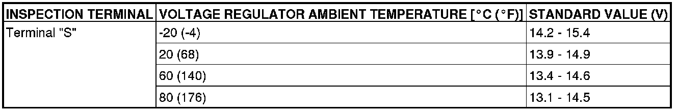 If the voltage is outside the standard value, there is a malfunction of the voltage regulator or the generator (Refer to the following table).