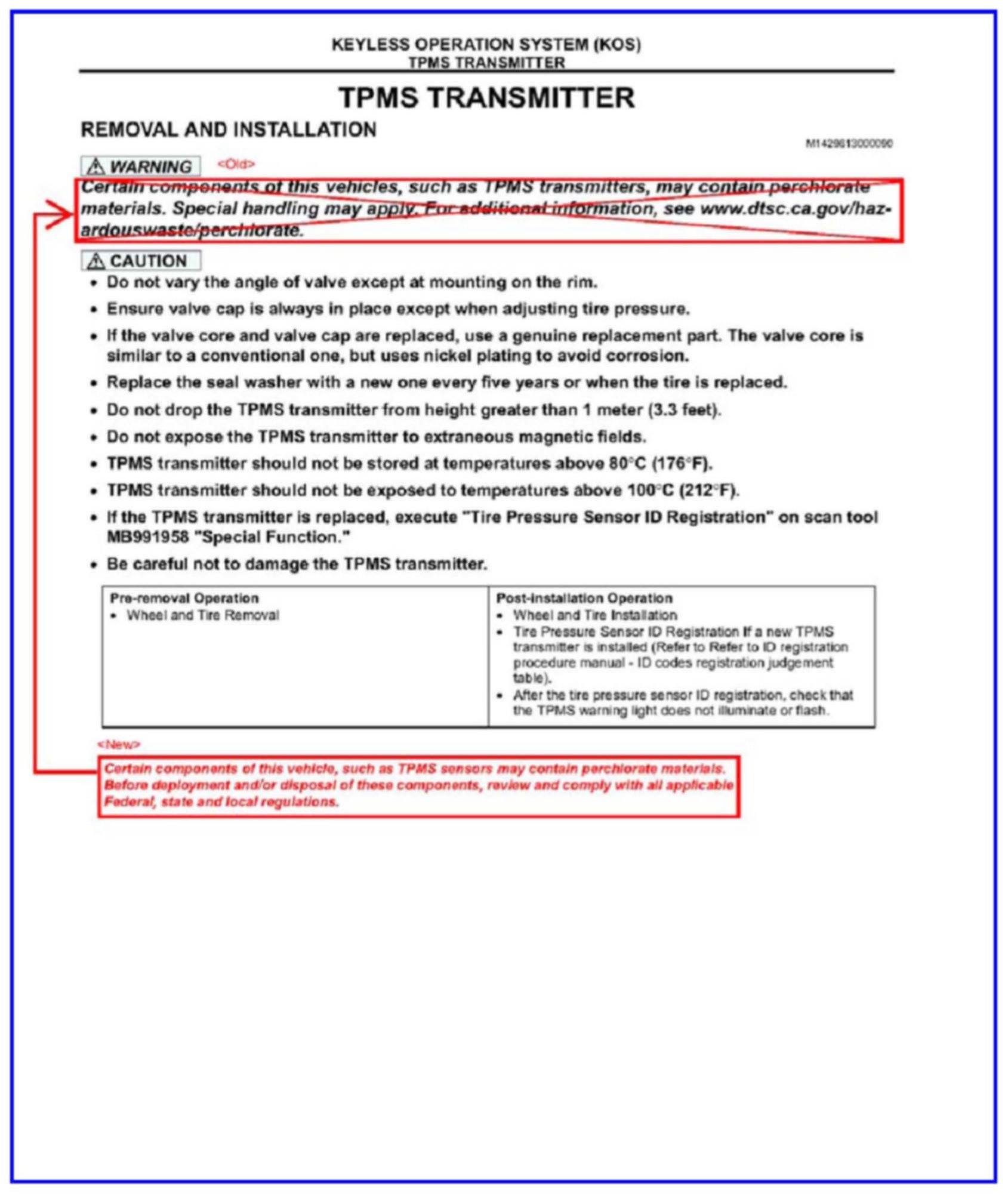SUBJECT: UPDATED KOS, TPMS, AND WCM CAUTION STATEMENTS - SERVICE MANUAL REVISION