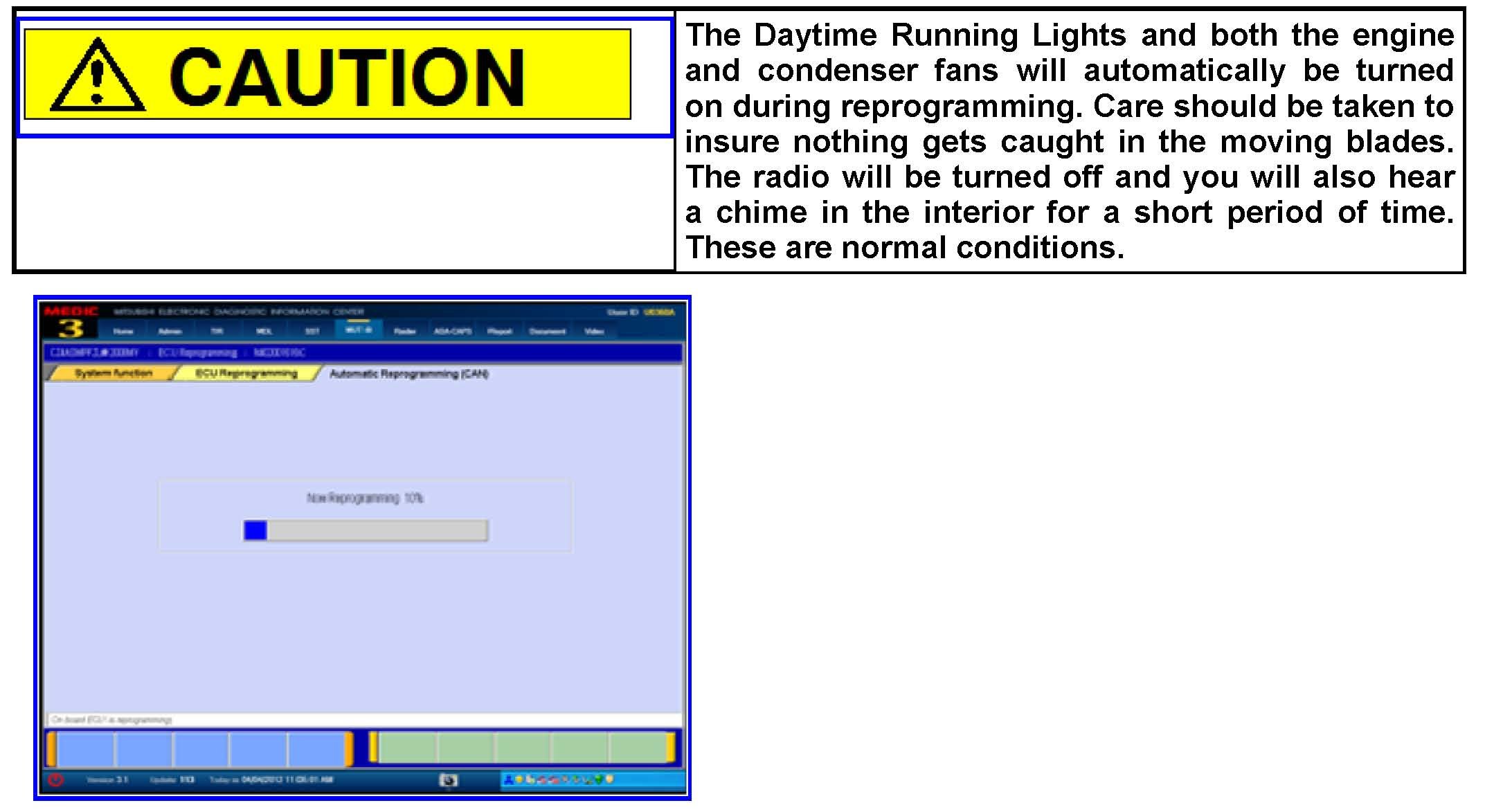 This process takes approximately seven minutes to complete. A battery charger should be attached to the vehicle battery and the MUT Ill should be plugged into it's charger to prevent the program from stopping prior to completion.