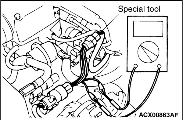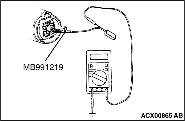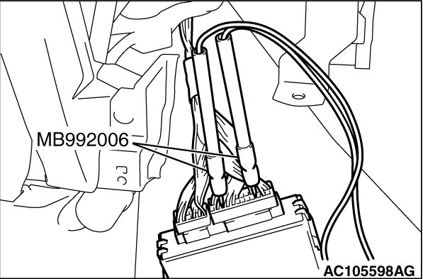 Inspect by inserting a test probe from the harness side. If the connector is too small to insert a test probe (e.g. control unit connector), do not insert it forcibly. Use special tool MB992006 (extra fine probe).