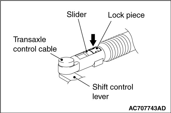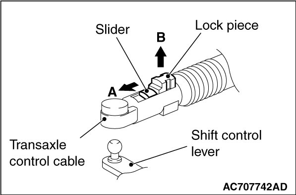 2. Move the slider of the transaxle control cable (transaxle side) tip to the direction A to pull up the lock piece to the direction B.