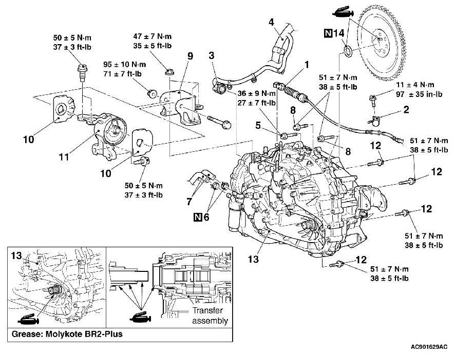 (3) Set the chain to the engine hanger plate (Special tool: MB992201) to support the engine and transaxle assembly. Remove the garage jack, and then remove the transaxle assembly upper part coupling bolts that have been loosened previously.