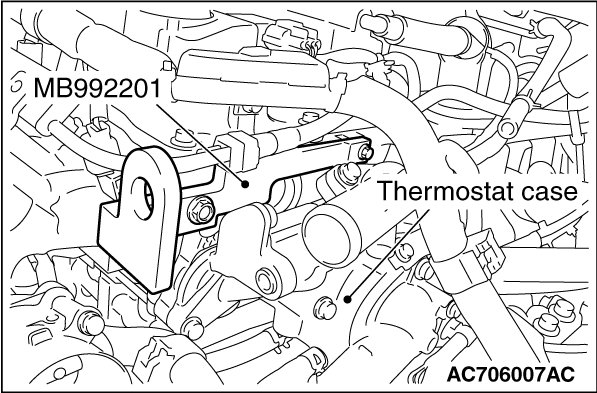 1. Remove the vacuum pipe assembly (refer to Water Hose and Water Pipe Removal and Installation), and install the engine hanger plate (Special tool: MB992201), then tighten the bolts to the specified torque.