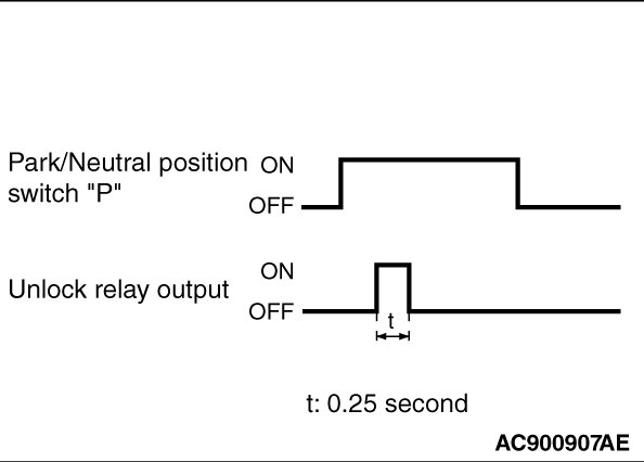 When the selector lever is shifted to the P position with the ignition switch turned ON, the lever position sensor "P" turns ON, ETACS-ECU turns the unlock relay output ON for 0.25 second to unlock all the doors.