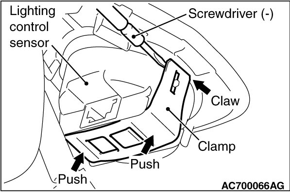 While pushing the clamp to the windshield side, pry up the clamp to disengage the right and left claws using the screwdriver (-), and then remove the lighting control sensor.