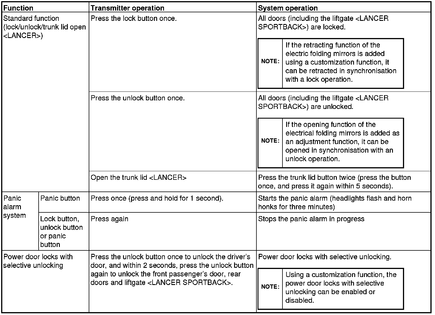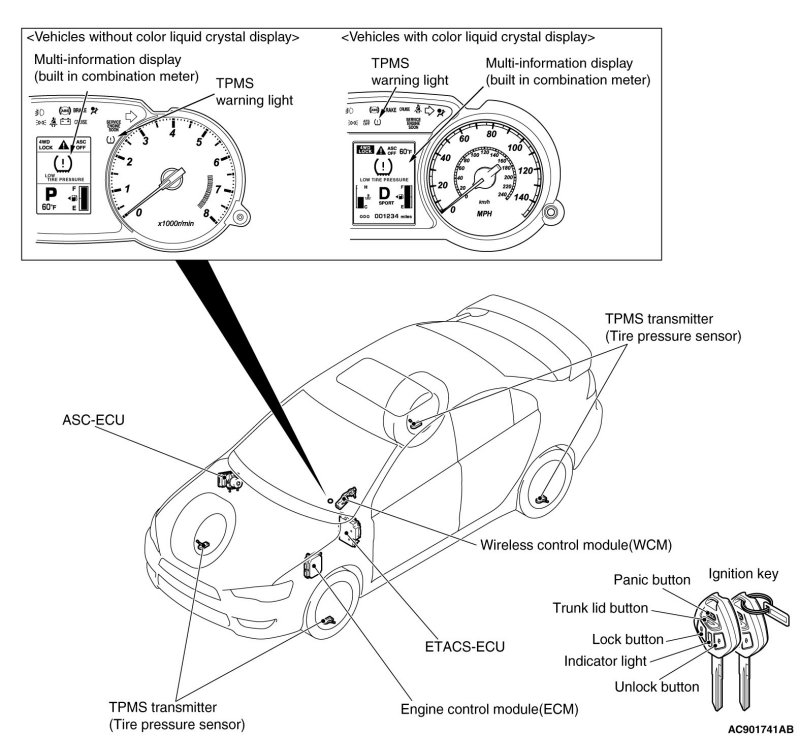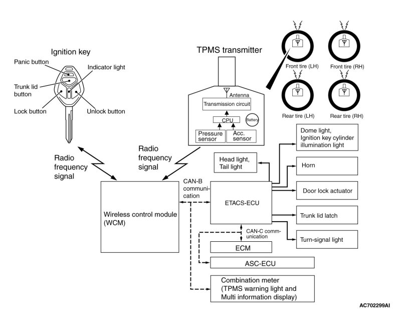 The wireless control module (WCM) is a system that integrates the keyless entry function with which remote operation (opening/closing of all doors, opening of trunk lid [LANCER], liftgate [LANCER SPORTBACK] and warning function to warn a person who intends to damage the vehicle*) can be performed by operating the lock/unlock /trunk lid button or panic button on the ignition key (transmitter). Also, WCM incorporates the immobilizer function, which prohibits the starting of engine using an unauthorized key, and the tire pressure monitoring system (TPMS), which issues a warning to a driver by illuminating or flashing the warning light if an abnormality to the tire pressure or system is detected. WCM has the following features: