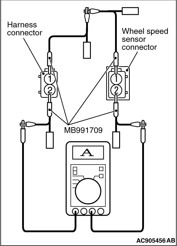 Use the special tool test harness (MB991709) to connect a multimeter between the wheel speed sensor-side connector and the wiring harness connector terminal No.2.