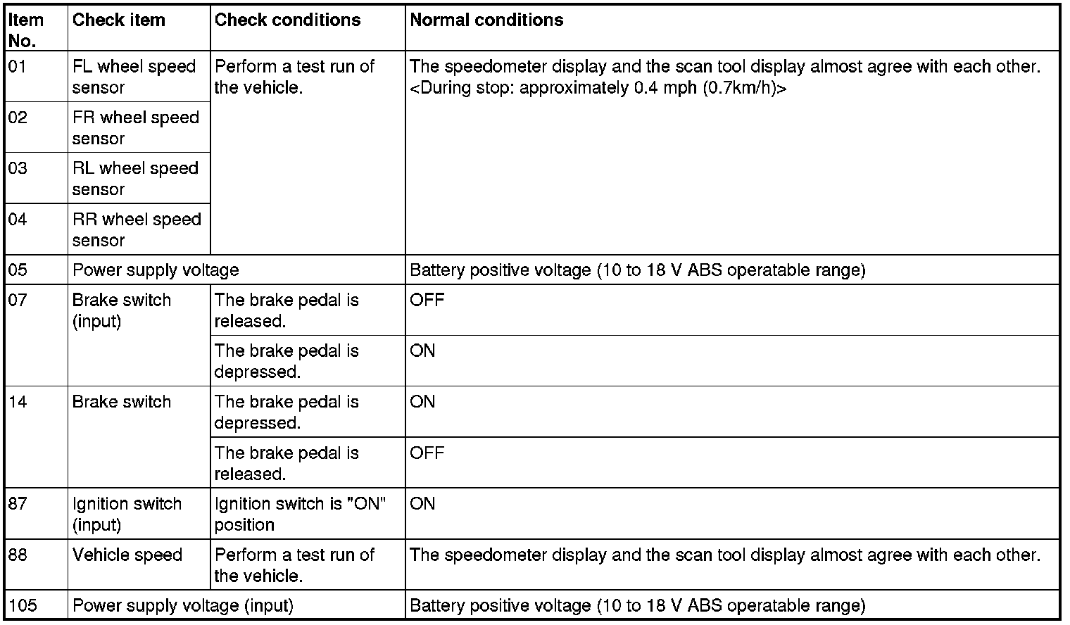 The following items can be read by the scan tool from the ABS-ECU input data.
