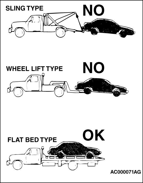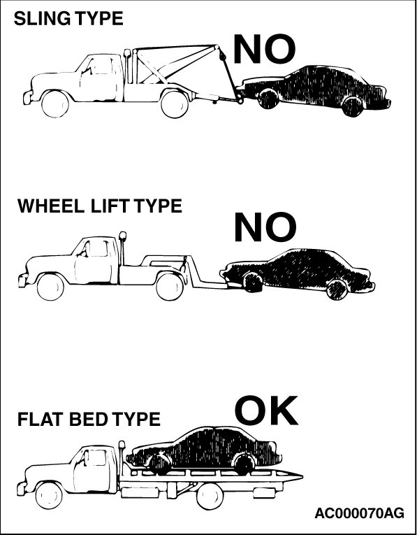 - This vehicle cannot be towed by a wrecker using sling-type equipment; otherwise the bumper may become deformed. If this vehicle is towed, use wheel lift or flat bed equipment.