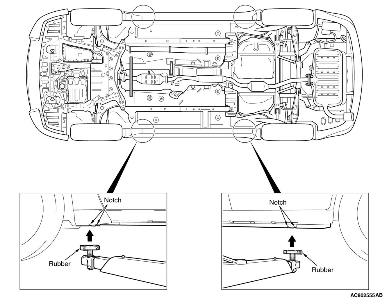 Special care should be taken when raising the vehicle on a frame contact type hoist. The hoist must be equipped with the proper adapters in order to support the vehicle at the proper locations.
