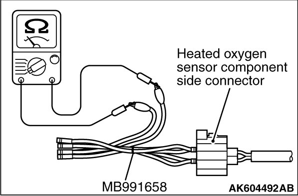 1. Disconnect the heated oxygen sensor connector and connect special tool MB991658 to the connector on the heated oxygen sensor side.