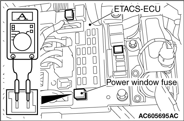 1. Remove the power window fuse, and connect a multimeter as shown in the illustration.