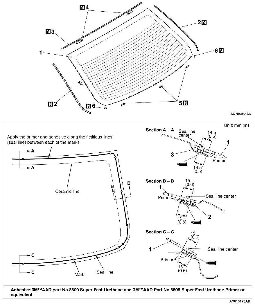 ]]A[[ FASTENER/REAR WINDOW SPACER/GLASS STOPPER/REAR WINDOW UPPER DAM/REAR WINDOW SIDE DAM INSTALLATION