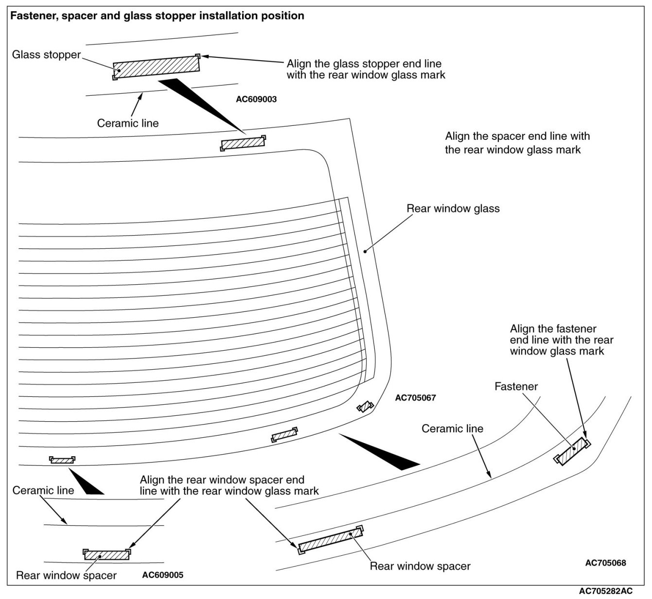 Install the fastener, rear window spacers, and glass stoppers to the specified positions so that there are no adrift or warped surfaces inside the rear window glass.