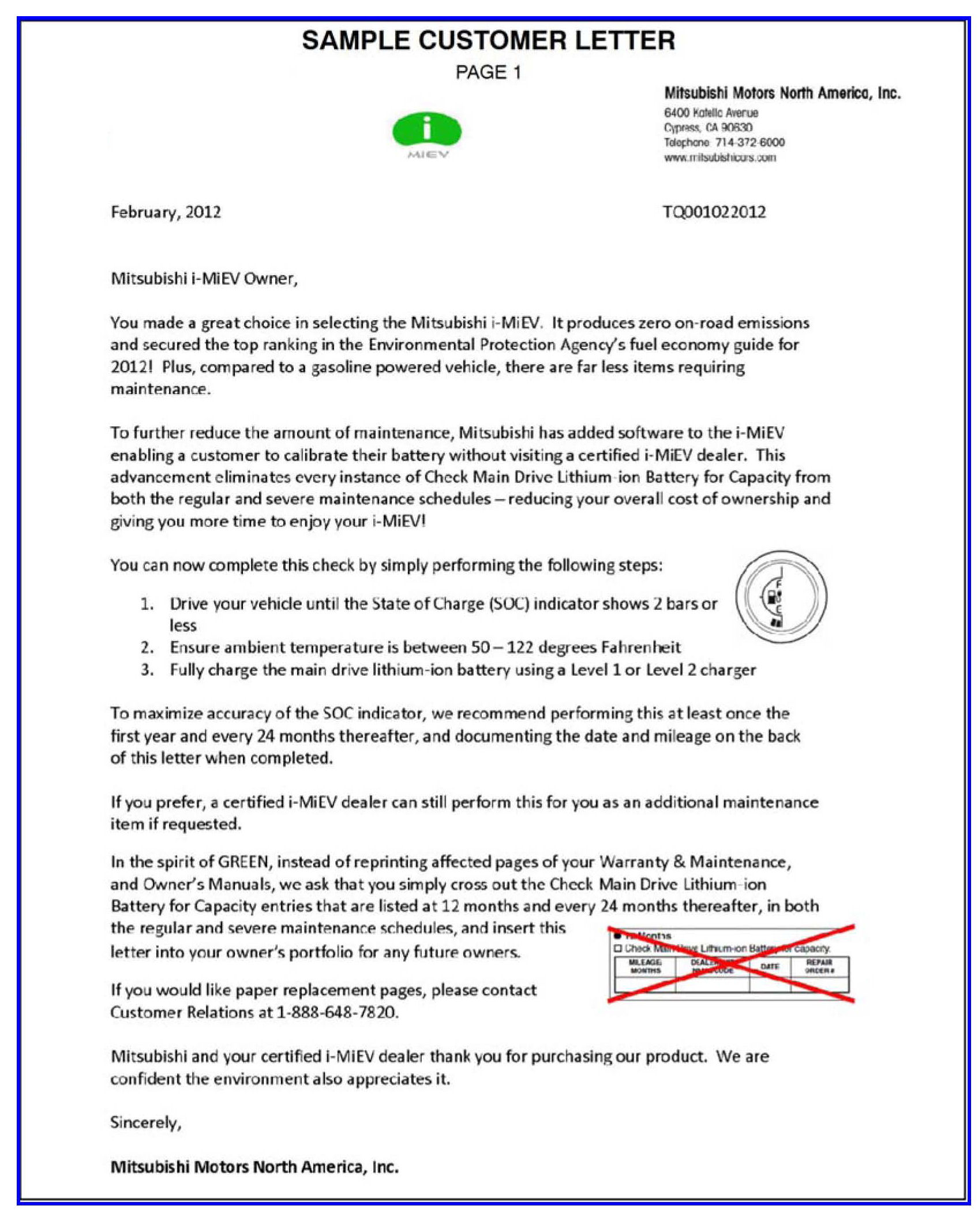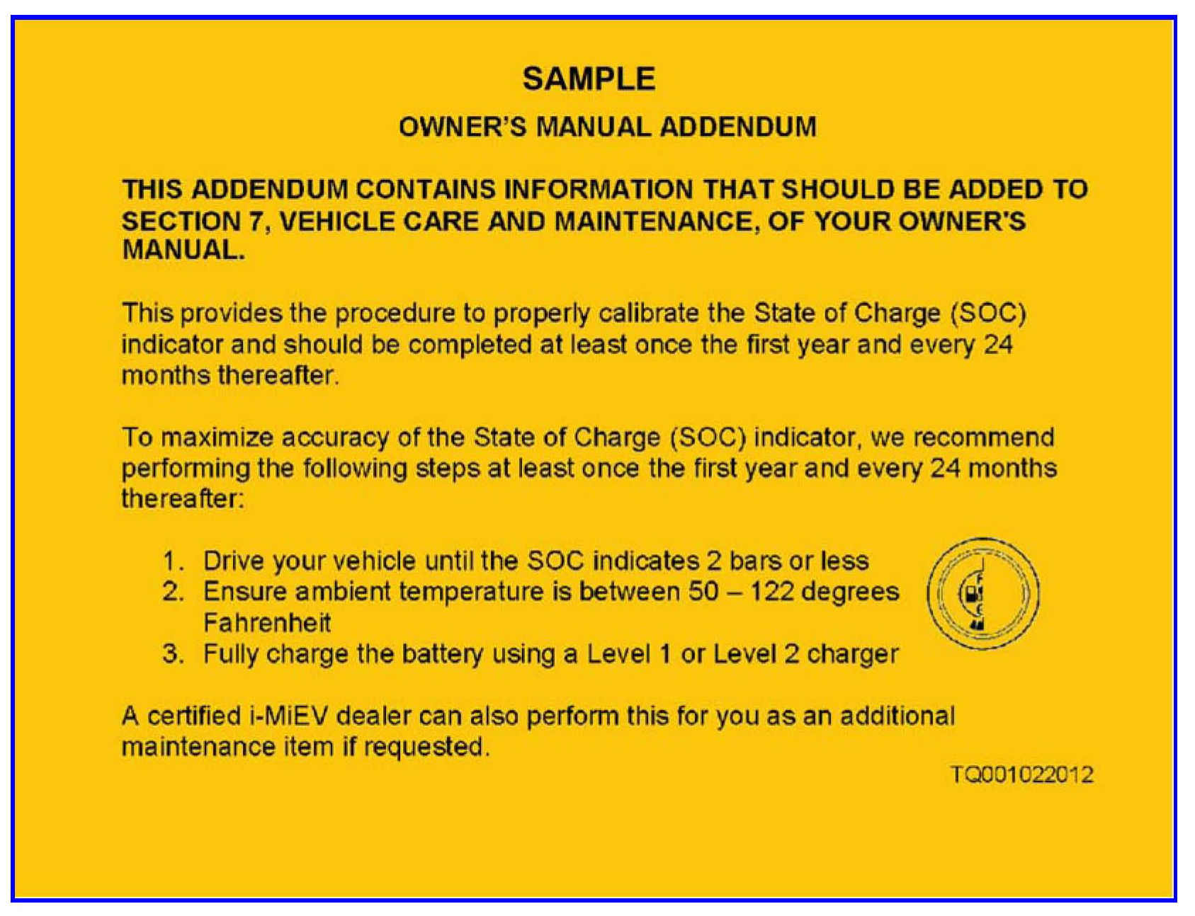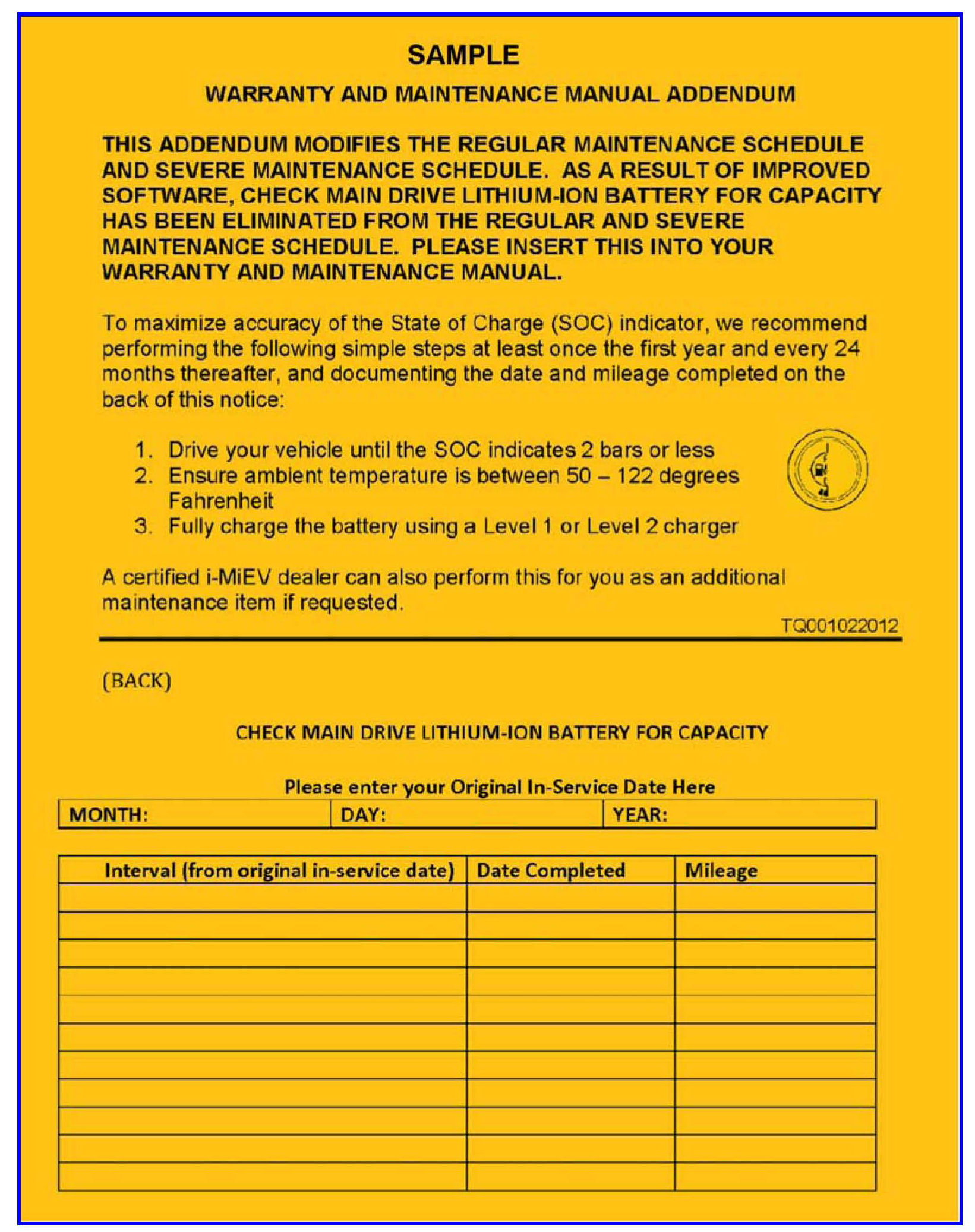 MMNA will mail registered owners a letter advising them of the change. Dealers will receive a sufficient supply of both the Warranty and Maintenance Manual Addendum, and the Owner's Manual Addendum in a separate mailing. Upon receipt, please place one of each addendum into the owner's portfolio for each 2012 i-MiEV in dealer inventory. Vehicles shipped from port stock on or after 02/24/2012 will have the addendums already in the glovebox.