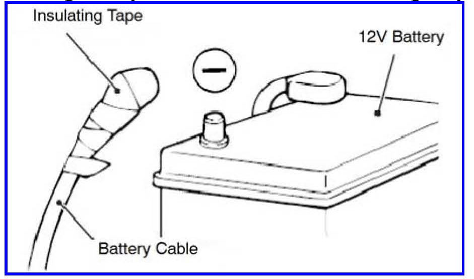 1. Remove the 12V battery cover and disconnect (-) terminal of the battery. Wait at least 60 seconds. Insulate disconnected (-) terminal with electrical tape.