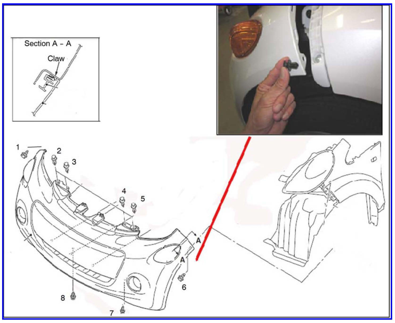 4. Remove 8 fasteners as shown in the following illustration. Unhook the claws located at the upper left and upper right corners of the front bumper (see Section A -A).